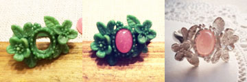 ワックス素材でジュエリーの原型を作り、鋳造を経て作品に。